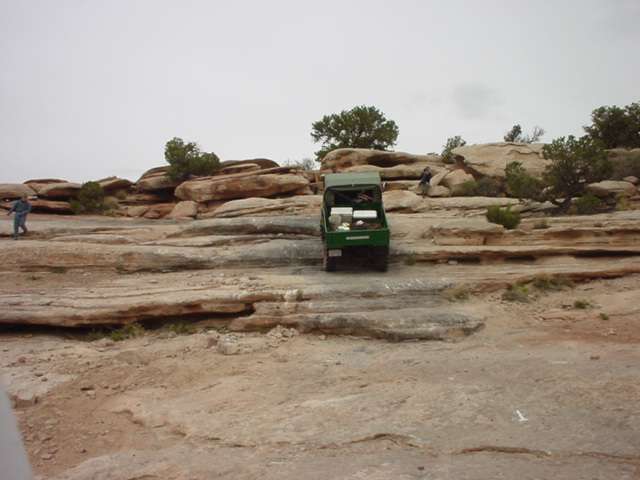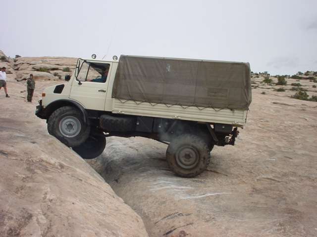There were a few more big steps to climb, but none of the Unimogs had any trouble with them. We stopped for a break after we got down off the rocks, and then we all went back into town. We all met for Chinese food, and Kai presented a bunch of awards. Ron McLaughlin won the "Longest Drive" award, Dan Johnson won the "Most Body Damage" award, although the damage was pretty minor. Bob Newsome got the "Best Trail Ettiquette" award for being so helpful out on the trails. The "Huevos Grandes" was won by Rob Pickering. He likes to test the limits of his Mog. Bill Caid won the "Big Billfold" award, and incidentally, provided all of the materials that Kai welded together to create the trophy's. They were made from all the broken gears and bearings that Kai replaced in Bill's U1300. Some of those things were really heavy! John Wessels won the "Elegant Driving" award. Brad and Mary Beesley were awarded the "Parkers Choice" trophy for spending their honeymoon with all of us in Moab. And finally, Kai gave the "Most Savory Co-Driver" award to his wife Tina.