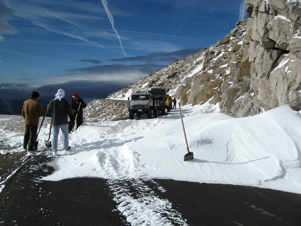 Once through the last drift, the remaining couple of swithbacks were clear. Dr. Stencel opened the final gate on the summit, which gave access to the dirt road which drops down and then back up to the observatory. There was one 4 foot deep drift which again was destroyed by Jay in the U1250. He snatched me through, and the rest were able to make it without assistance. The final drift at the observatory was no problem, so we parked and unloaded the gear.